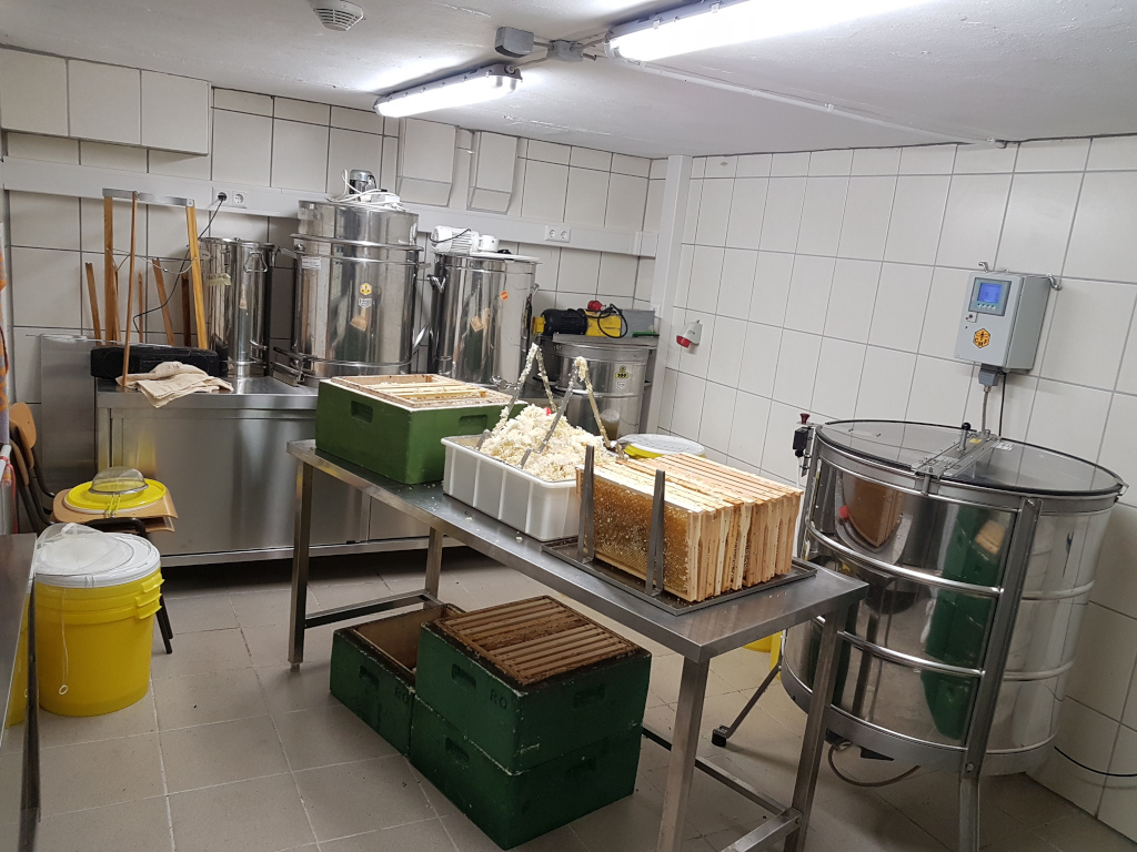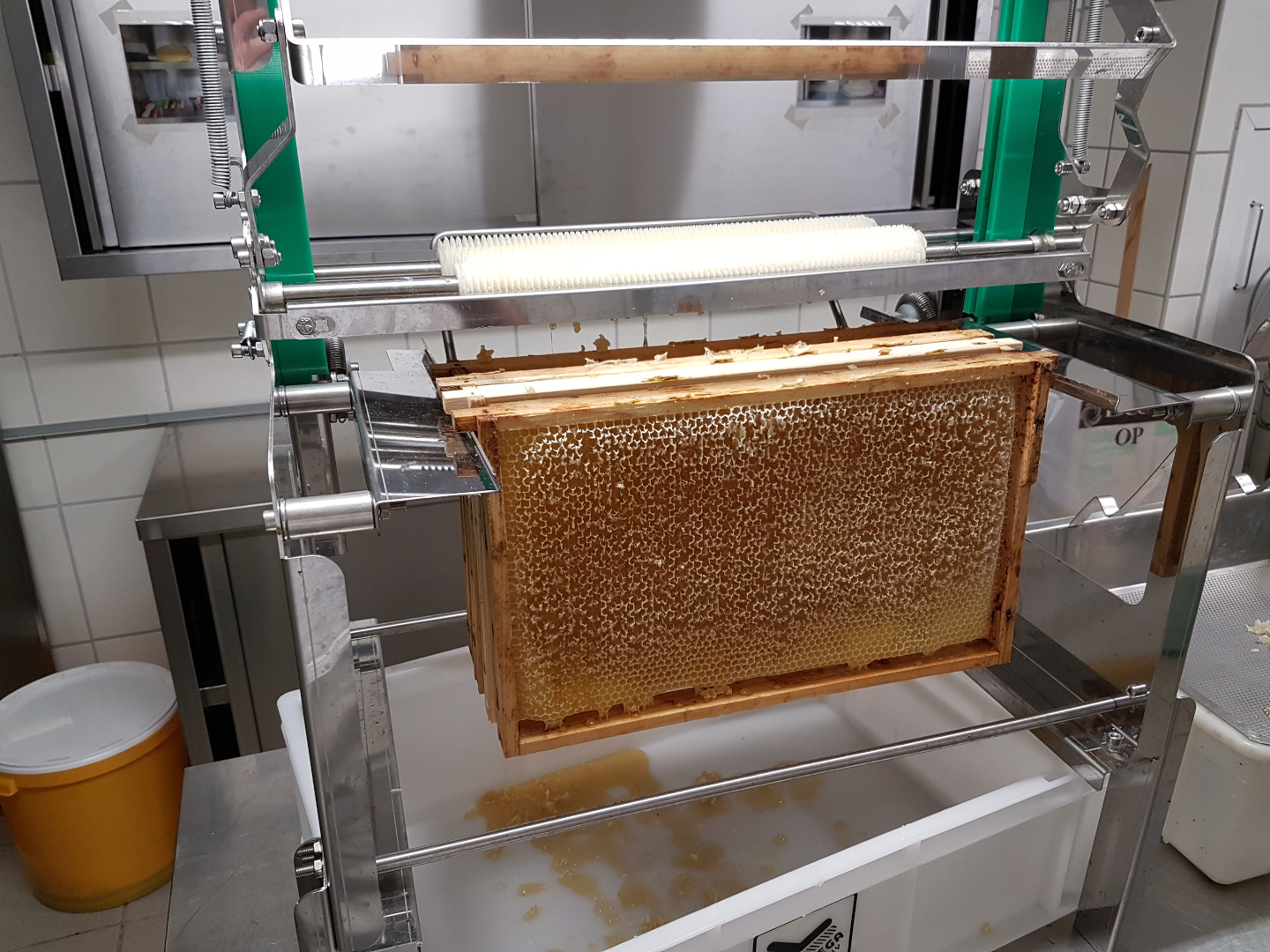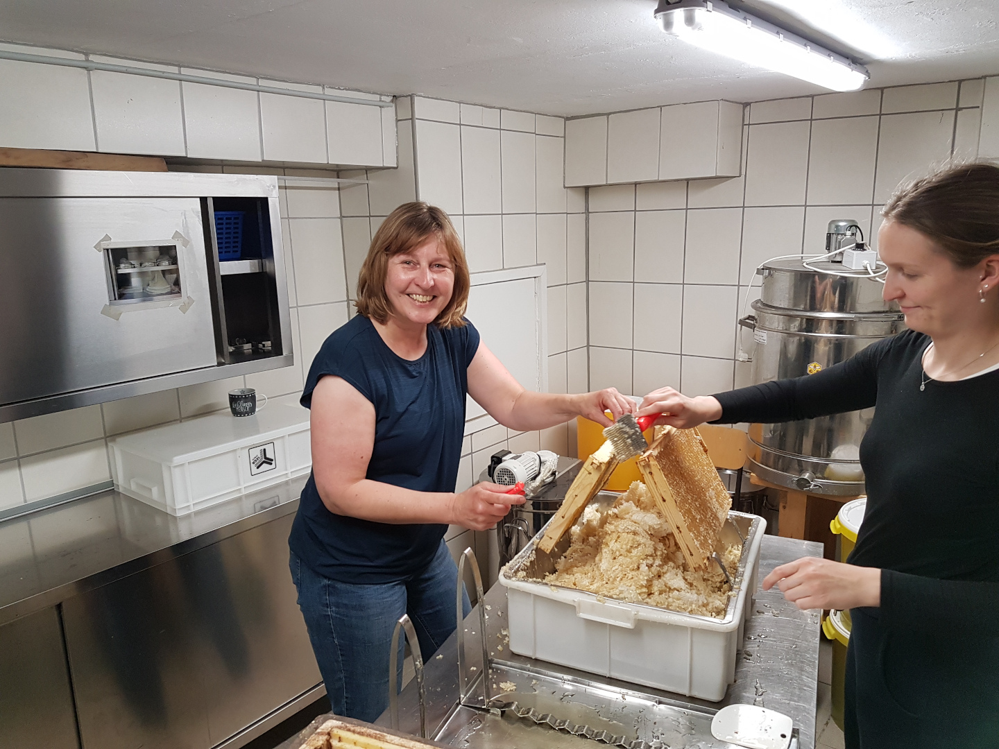 Die Honigräume werden ohne Bienen in den Schleuderraum gebracht. Dann werden die Waben entdeckelt. D.h. es werden die kleinen weißen Wachsdeckelchen, mit denen die Bienen den Honig verschossen haben, entfernt. Der Honig wird geschleudert, gesiebt und in Eimer abgefüllt.