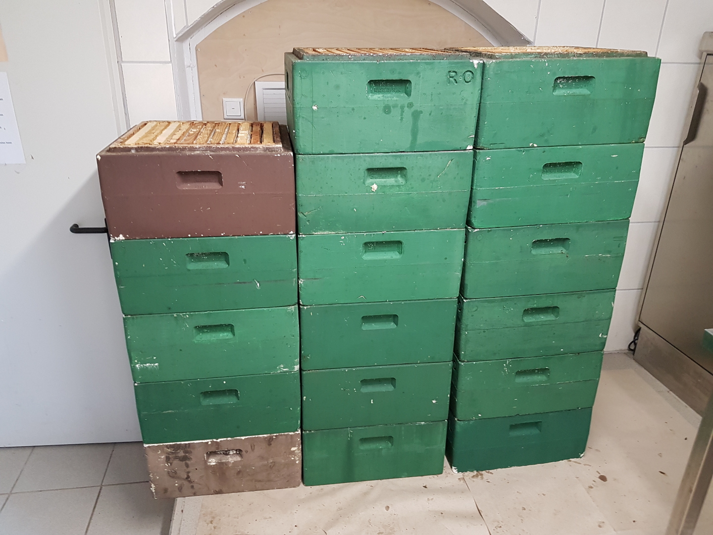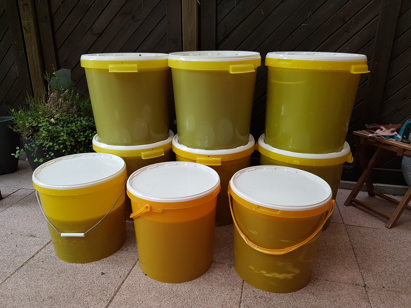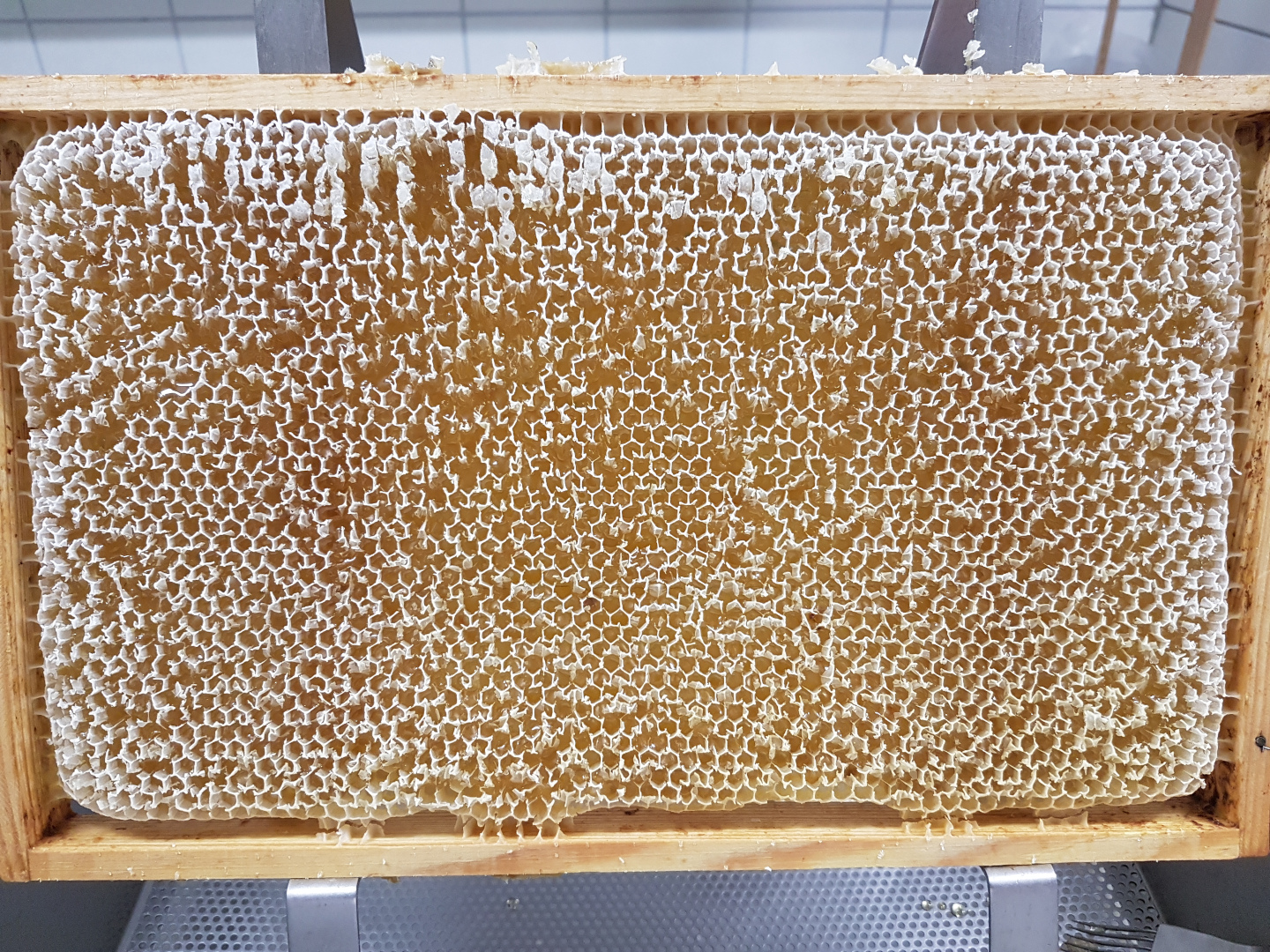 Die Honigräume werden ohne Bienen in den Schleuderraum gebracht. Dann werden die Waben entdeckelt. D.h. es werden die kleinen weißen Wachsdeckelchen, mit denen die Bienen den Honig verschossen haben, entfernt. Der Honig wird geschleudert, gesiebt und in Eimer abgefüllt.