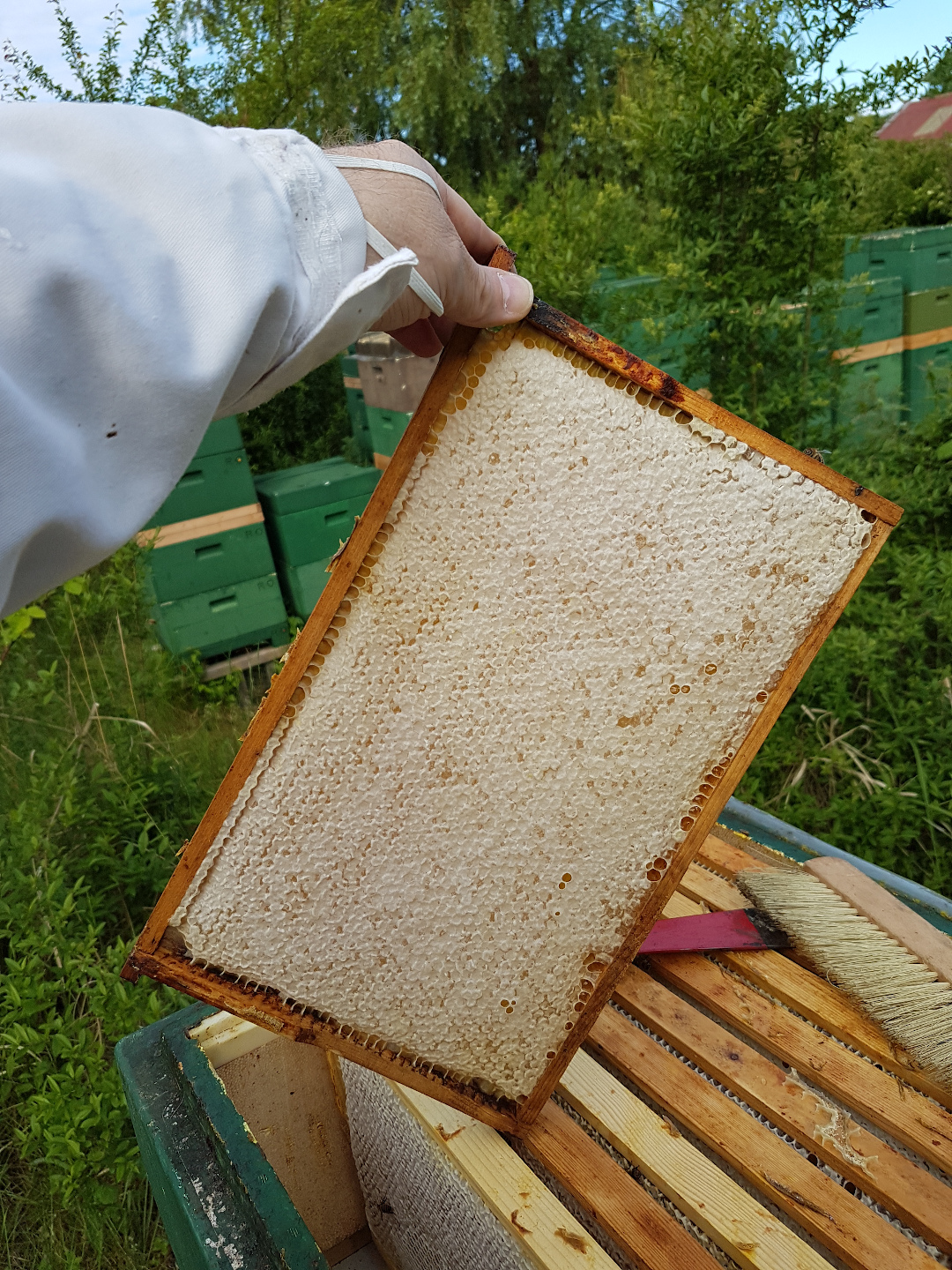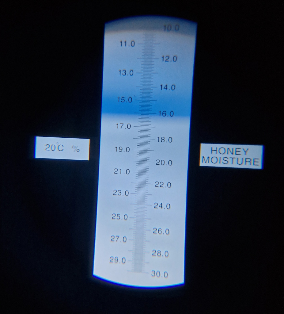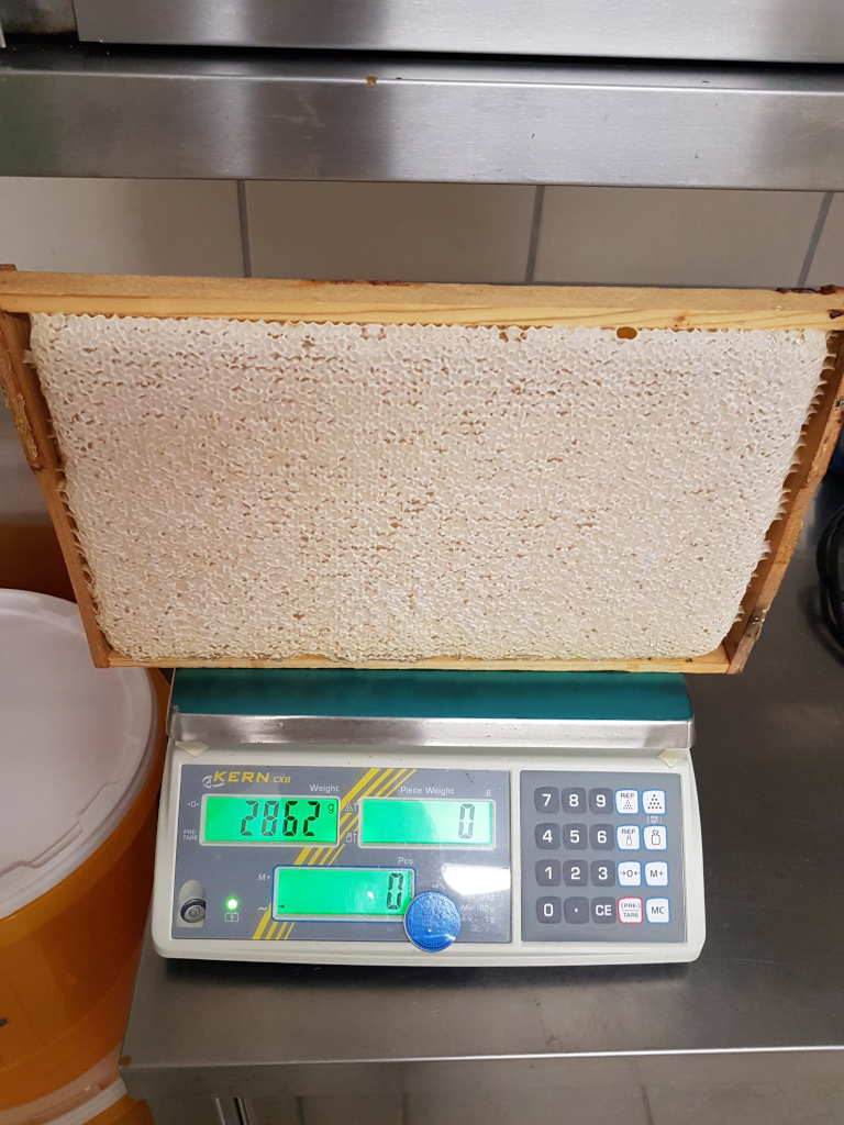 Ob der Honig reif ist, also den richtigen Wert an Restfeuchte hat, kann man durch eine Spritzprobe erkennen. Wenn die Waben komplett verdeckelt sind, haben die Bienen schon entschieden, dass der Honig erntereif ist.